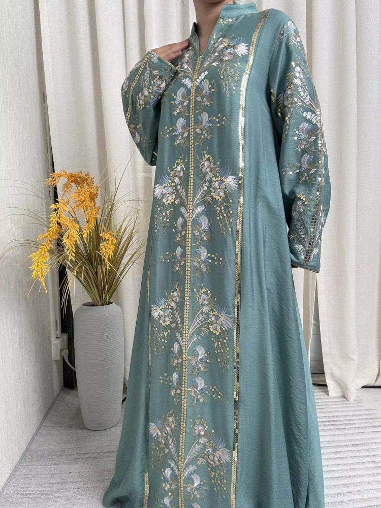 - اسم المنتج: عباية طويلة بياقة واقفة وتفاصيل زهرية